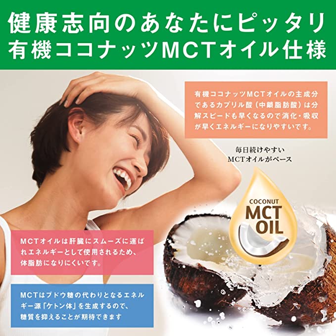 - 【有機MCTオイル配合】ココナッツ風味で飲みやすい有機MCTオイルは、消化・吸収スピードが速く、体脂肪になりにくいとされており、毎日の習慣にできます。そのままお飲みいただいても、ヨーグルトやお飲み物にオイルをかけてもお召し上がりいただけます